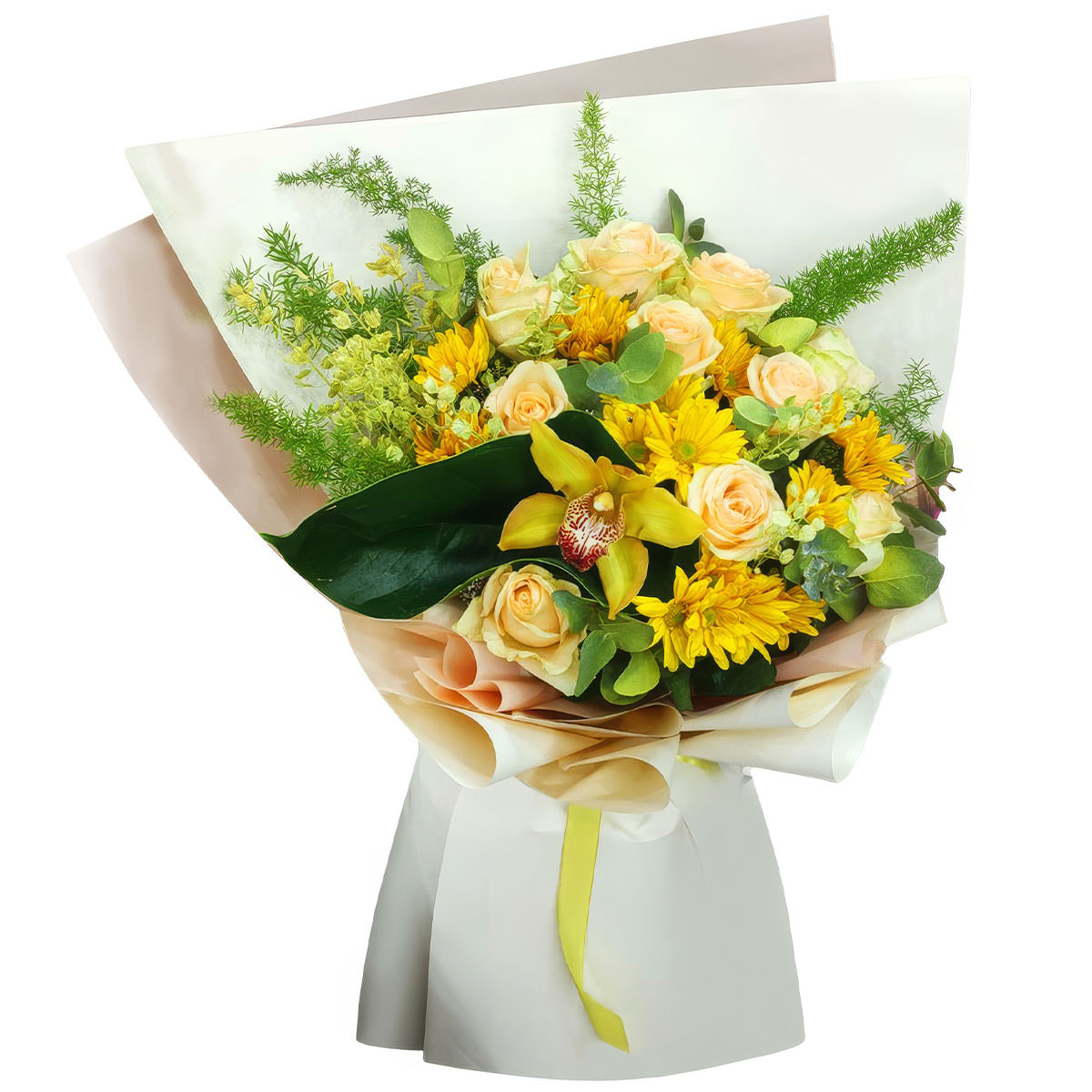 Орхидея желтая, хризантема кустовая желтая, роза кустовая кремовая, лунария, зелень. Упаковка (лента, пленка, крафт, сетка, пленка матовая)