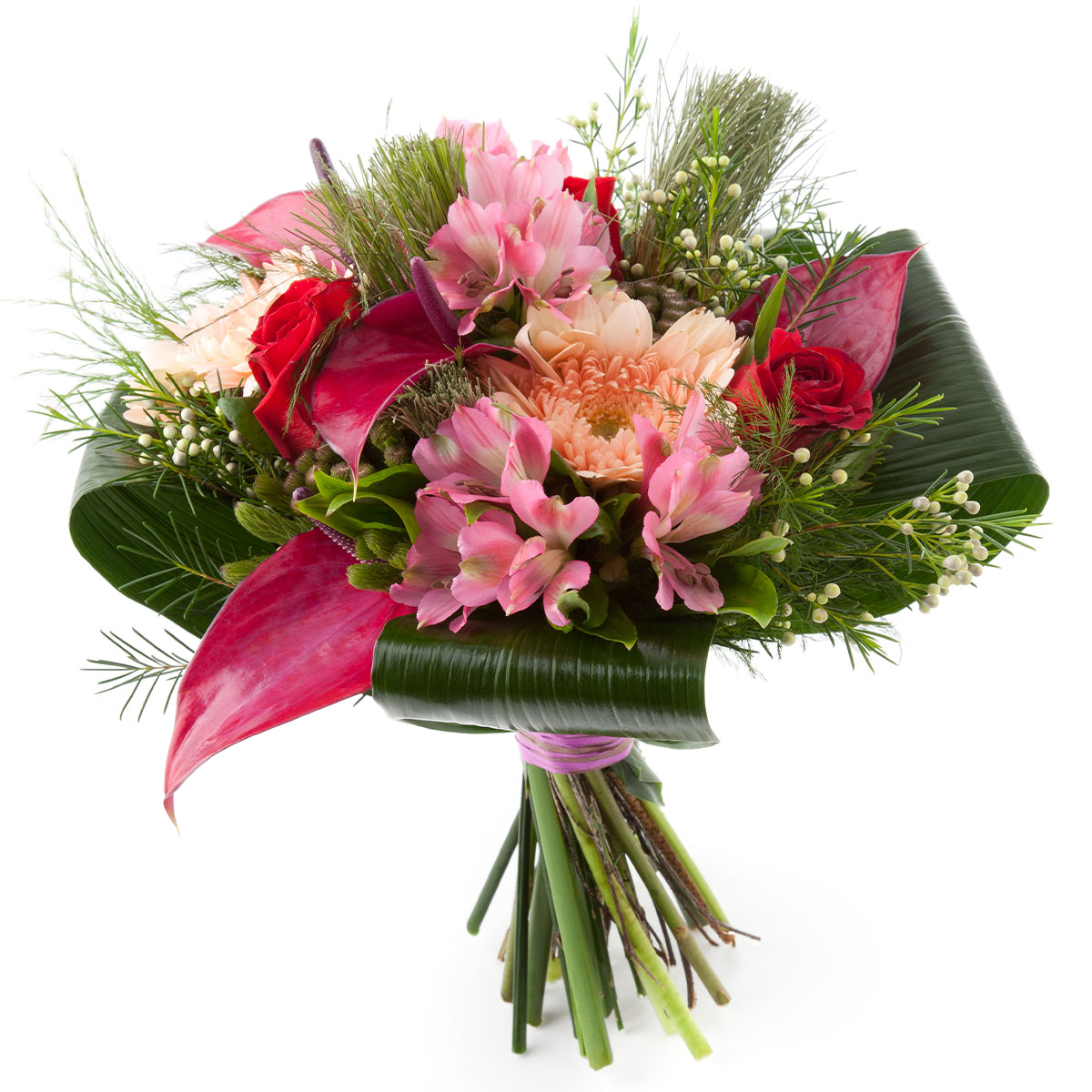 Гербера кремовая, эустома розовая, роза одноголовая красная, калла розовая, озотамнус, аспидистра, зелень. Упаковка (лента, пленка, крафт, сетка, пленка матовая)