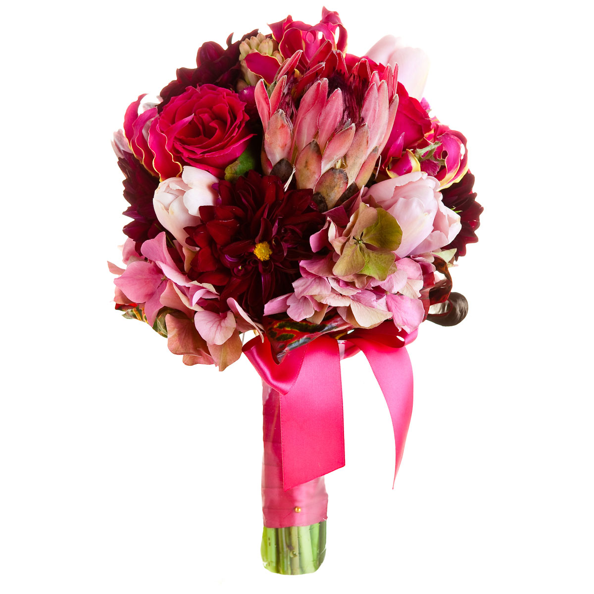 Протея, гортензия розовая, тюльпан розовый, роза одноголовая розовая, георгина бордовая. Упаковка (лента, пленка, крафт, сетка, пленка матовая)