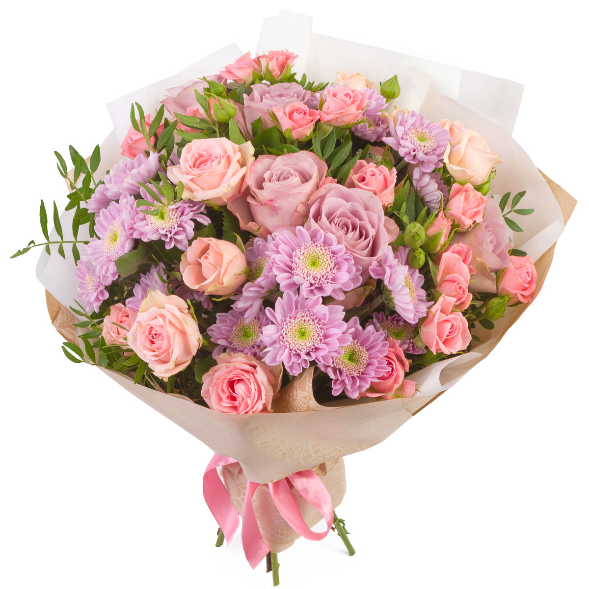 Роза одноголовая сиреневая, роза кустовая розовая, хризантема кустовая сиреневая, фисташка. Упаковка (лента, пленка, крафт, сетка, пленка матовая)