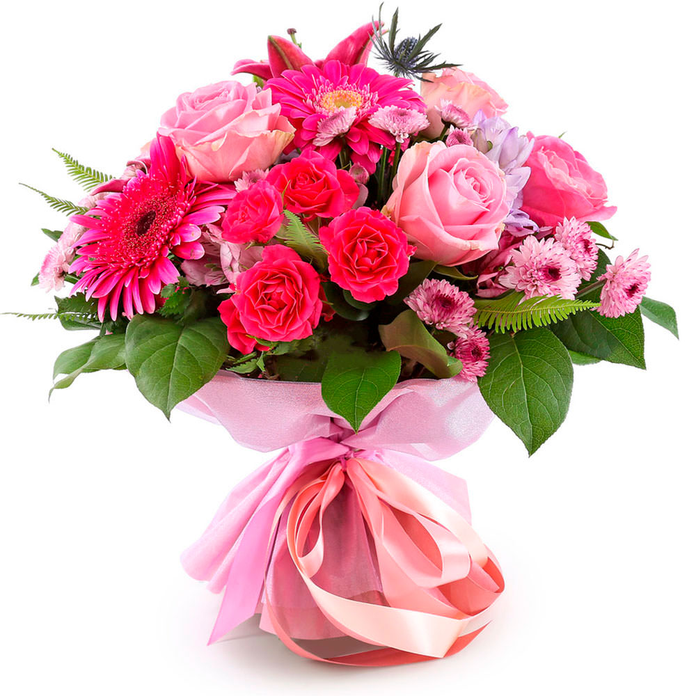 Роза одноголовая нежно-розовая, гербера розовая, хризантема кустовая розовая, лилия розовая, альстромерия розовая, эвкалипт, эрингиум. Упаковка (лента, пленка, крафт, сетка, пленка матовая)