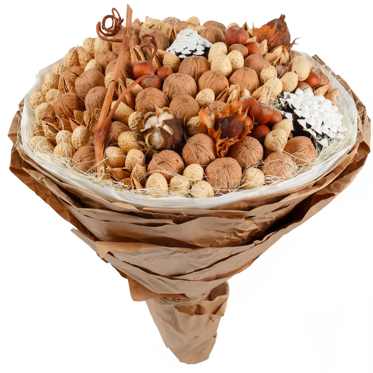 Орех грецкий, арахис, миндаль, фундук, хлопок, декоративные ветки. Упаковка (лента, пленка, крафт, сетка, пленка матовая)