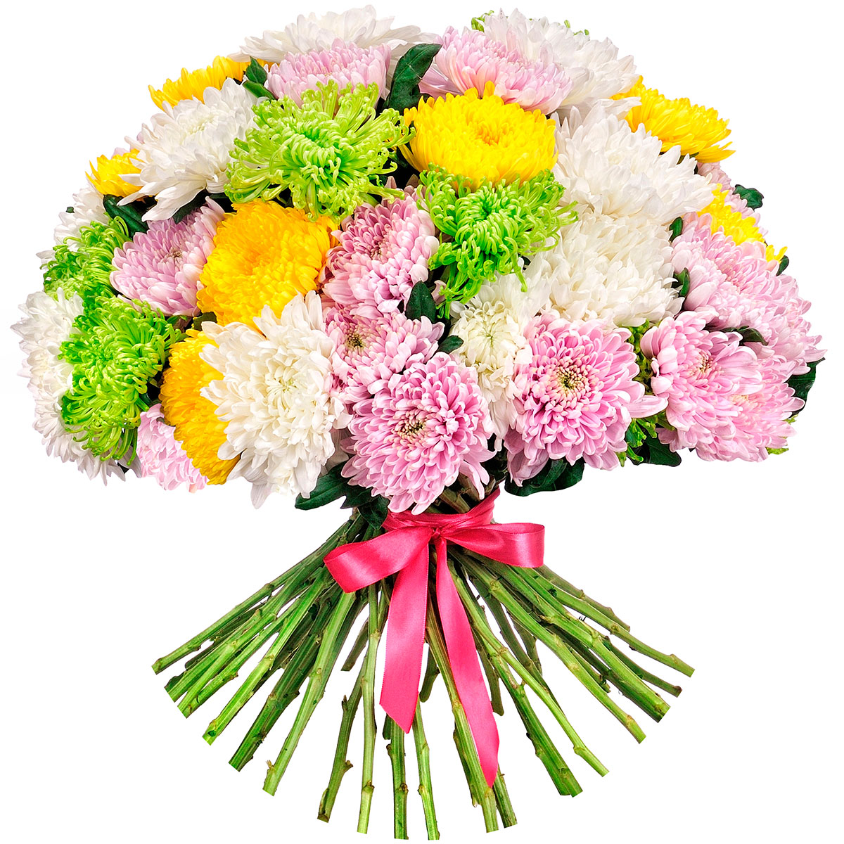 Одноголовые хризантемы розовые, белые, желтые, зеленые.