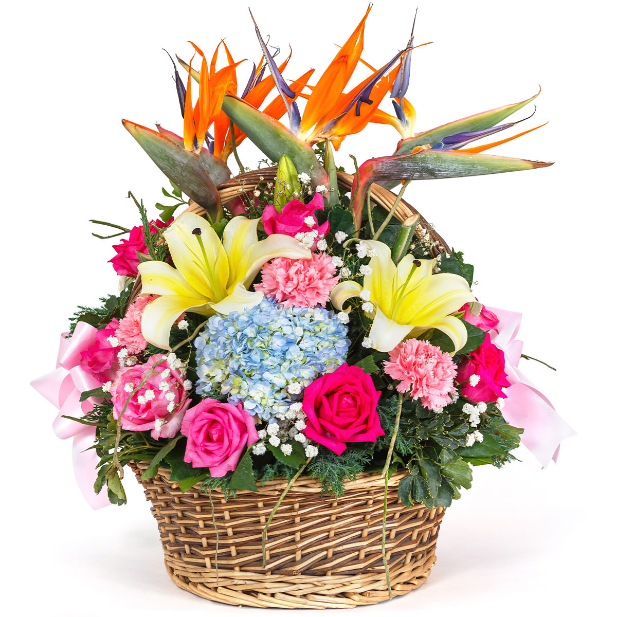 Роза одноголовая розовая, гортензия голубая, лилия белая, стрелиция, гвоздика розовая, гипсофила. Упаковка (Корзина, оазис, ящик).