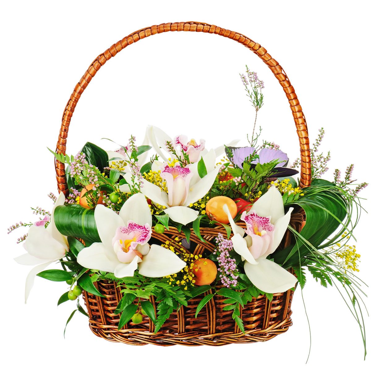 Орхидея белая, аспидистра, гиперикум, зелень. Упаковка (Корзина, оазис, ящик).