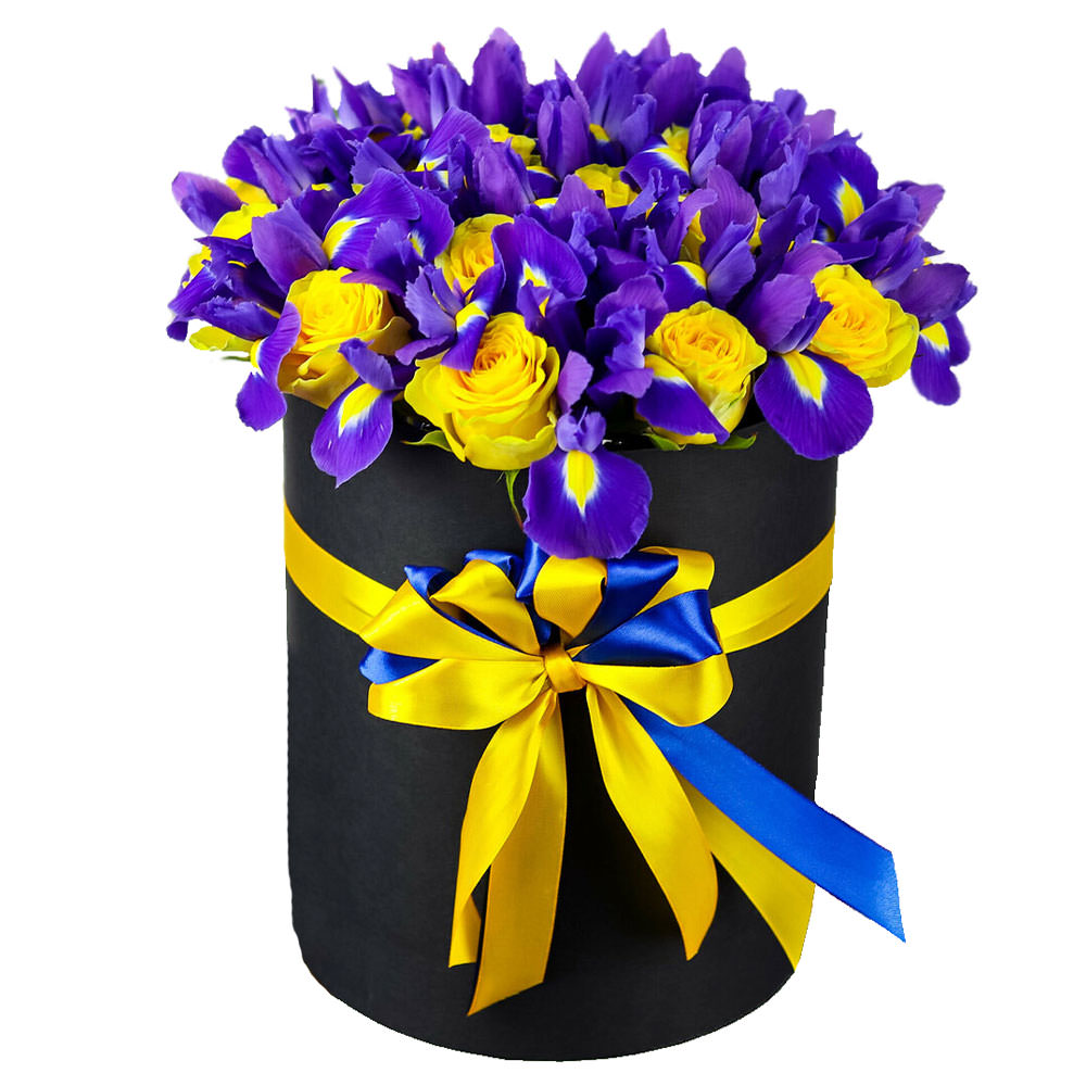 Ирис, роза кустовая желтая. Упаковка (шляпная коробка, квадратный бокс, коробка сердце, оазис)