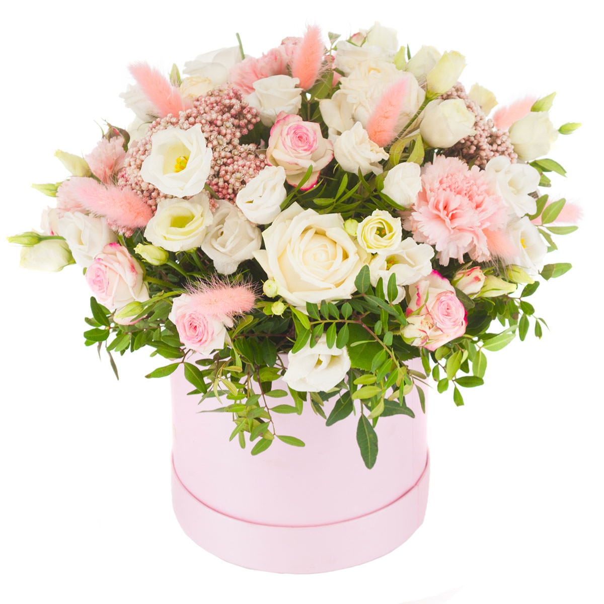 Роза одноголовая белая, роза кустовая розовая, эустома белая, гвоздика розовая, лагурус, озотамнус, фисташка. Упаковка (шляпная коробка, квадратный бокс, коробка сердце, оазис)
