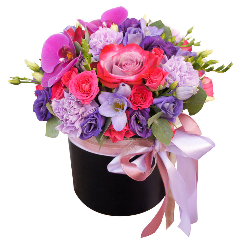 Роза одноголовая розовая, роза кустовая розовая, эустома фиолетовая, гвоздика сиреневая, орхидея розовая, фрезия, эвкалипт. Упаковка (шляпная коробка, квадратный бокс, коробка сердце, оазис)