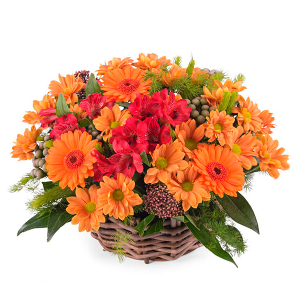 Гербера оранжевая, хризантема кустовая оранжевая, альстромерии красная, бруния, аспарагус, озотамнус. Упаковка (Корзина, оазис).